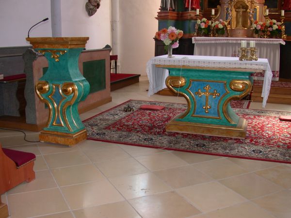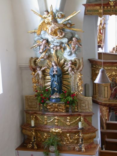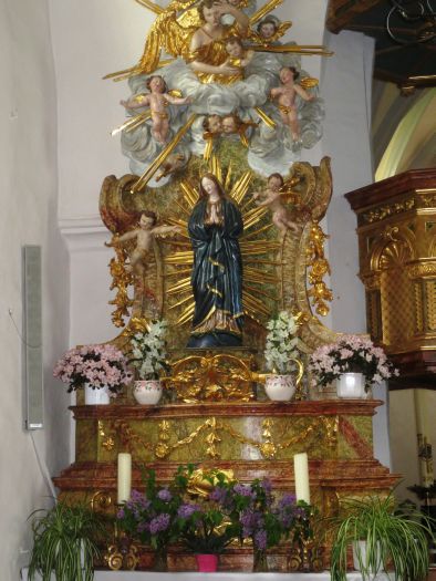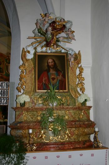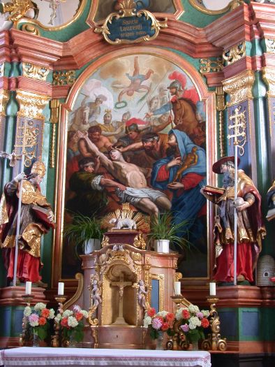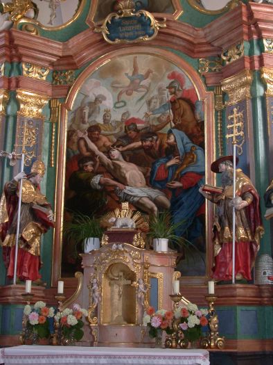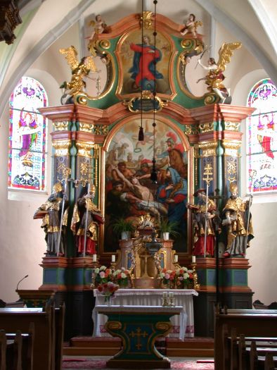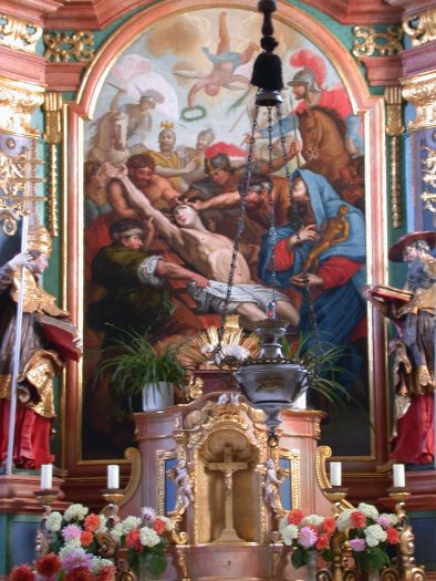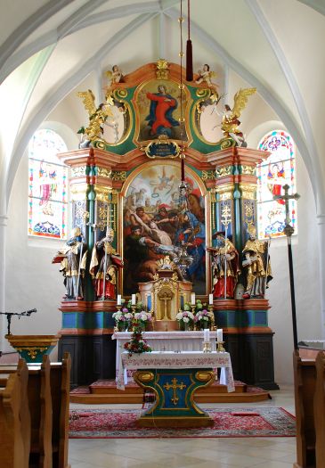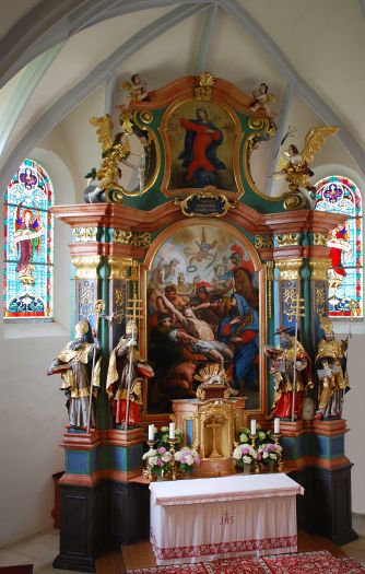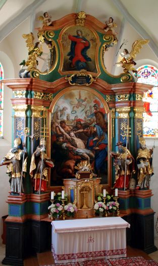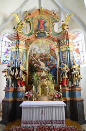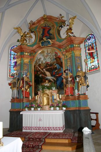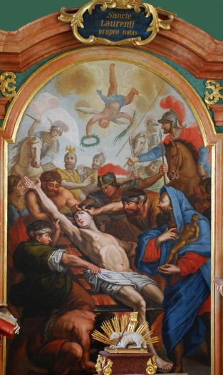 Das Hochaltarblatt zeigt die Marter des Titelheiligen St. Laurentius. Es wird flankiert von den Holzskulpturen der lateinischen Kirchenlehrer, links St. Augustinus und der heilige Papst Gregor, rechts. St.. Hieronimus und St. Ambrosius. Im Aufsatz befindet sich das Bild der Immakulata.