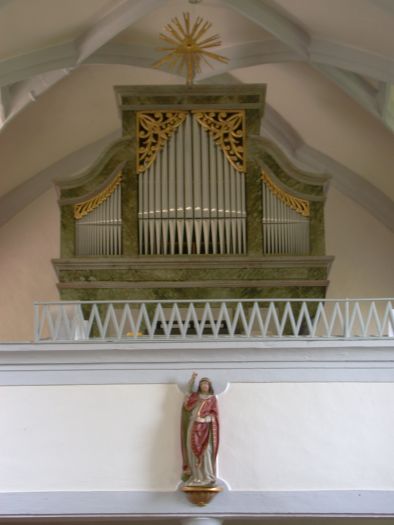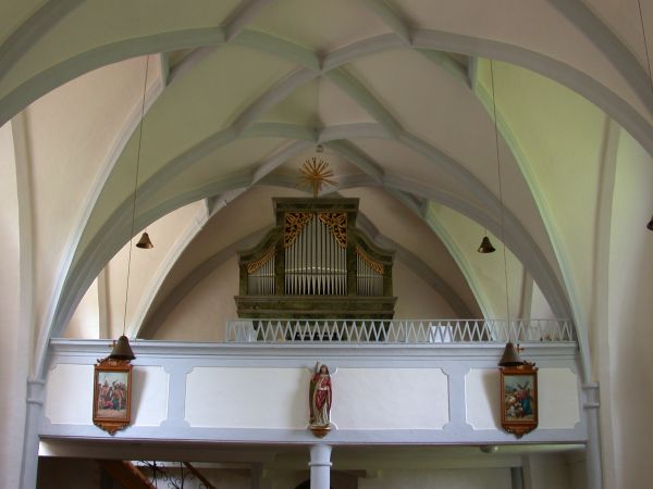 Auf der westlichen Emporenbrüstung ist das älteste Werk der Ausstattung angebracht, eine gotische Michaelstatue von etwa 1500, die in der Linken wohl einmal eine Waage und ihrer Rechten ein Flammenschwert getragen hat.